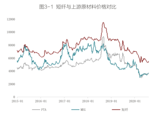 由于短纤与PTA、乙二醇之间的上下游结构,三者之间的套利关系也是客观存在的。若以原材料成本( 0.855xPTA+0.335 x MEG )和短纤价格做相关性分析,其2017、2018和2019年的相关系数分别高达0.84、0.96和0.98。 从此也能够看出,近年来短纤的定价模式越来越倾向于成本导向,短纤价格的波动基本上与原材料价格波动一致。
