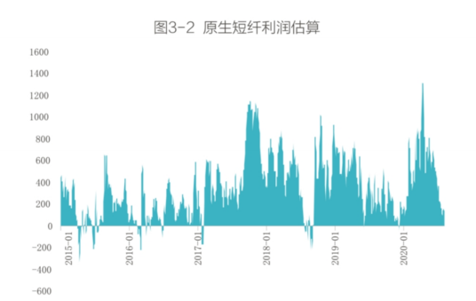 一般原生短纤行业的生产成本估算方法为0.855xPTA+0.335 X MEG+900,短纤价格扣除生产成本部分即为利润。在成本一定的情况下,价格的上涨或下跌本质上就是利润的变化。因此,在研究分析短纤市场时,应当时刻关注利润变化。