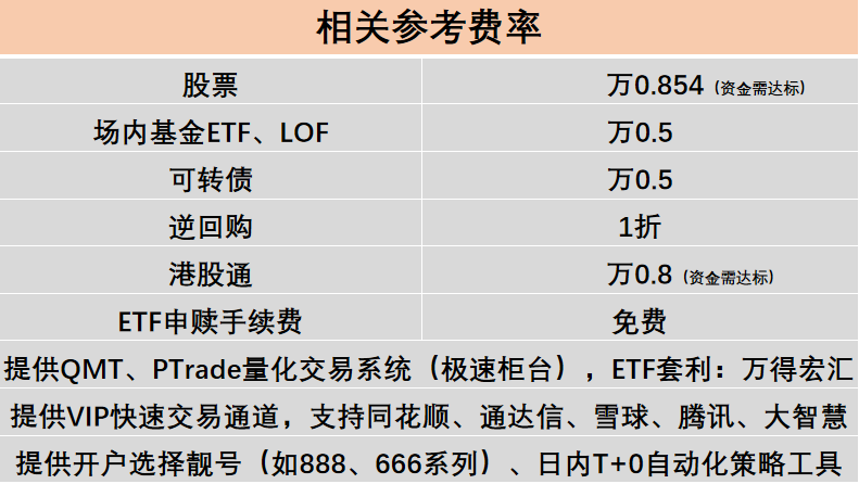 我司股票佣金低至万0.854(资金达标),ETF佣金低至万0.5,可转债佣金低至万0.5,免费提供量化交易软件,VIP快速交易通道。以下是相关费率标准,我司上市证券公司,欢迎电话/微信联系开户!