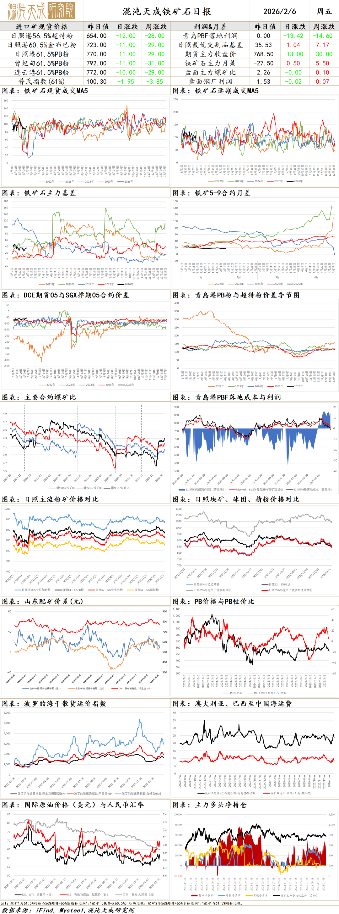 需求端,SMM最新调研显示本周铁水产量有小幅回升。昨日钢联高炉开工率继续小幅回升,但日均铁水仅略增0.6万吨至228.58万吨,同期钢厂盈利率持平仍在39.39%。随着钢厂铁矿库存显著增长,尽管进口矿日耗略有回升,钢厂进口矿库销比仍延续增长。受北方地区重污染天气及环保影响,叠加部分钢厂仍处年度检修阶段,且个别钢厂事故也导致高炉停产,节前铁水增长有限。随着钢厂铁矿库存持续上升且假期临近,近期钢厂对铁矿或将维持按需补库。昨日铁矿港口现货成交略有下降,但远期美元货成交继续回落,目前PB粉落地利润小幅扩大,显示当前国内需求仍强于海外。