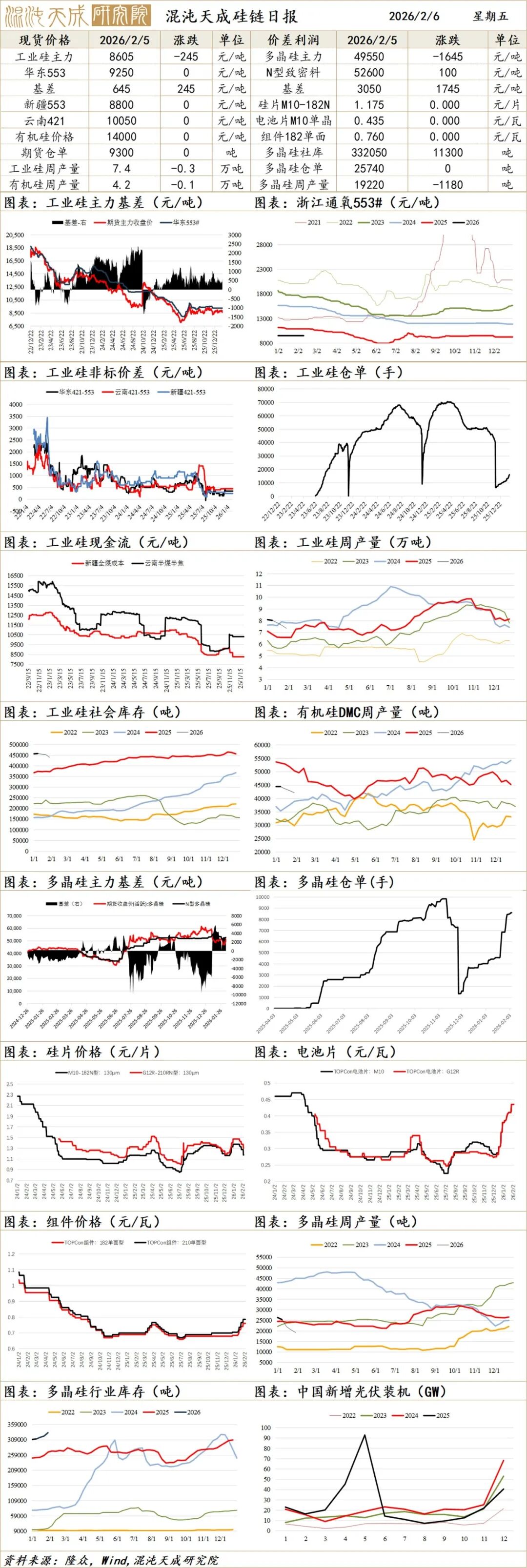 本周传现货多个工厂封盘挺价,现货市场报价混乱。2.5日光伏协议预计2026年装机在180-240GW。