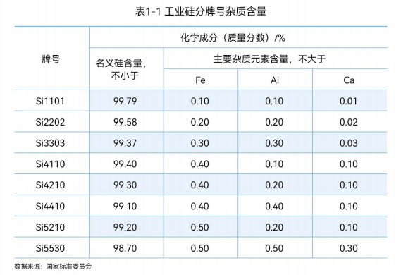 根据工业硅国家标准(GBT 2881-2014) ,工业硅按3种主要杂质(铁、铝、钙)含量的差异,分为Si5530、Si4410、 Si4210、 Si3303、 Si2202等 规格。工业硅的名义硅含量为100.0%减去杂质总和的余量,其余表中未列的微量元素含量不影响牌号的划分。