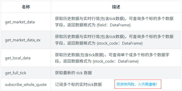 2.所以,若需要历史行情,请先使用界面端或者download_history函数进行下载;若需要最新行情,请向服务器进行订阅