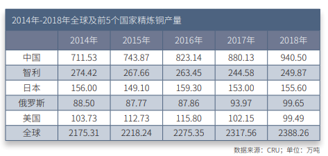 据英国商品研究所(CRU)统计数据,2018年全球精炼铜总产量为2388.26万吨,同比增长3.05%。全球生产量前五的国家分别是中国、智利、日本、俄罗斯和美国,上述5国产量的全球占比为64.70%。2018年全球铜精矿供应相对宽松,保证了精炼铜生产正常。亚洲仍居于精炼铜产量的首位,美洲和非洲依然是湿法铜最主要的产地。从近三年精炼铜产量趋势来看,中国是全球精炼铜增长主要的贡献国,且未来2年随着中国冶炼产能高速扩张,中国精炼铜产量仍会保持在较高水准。