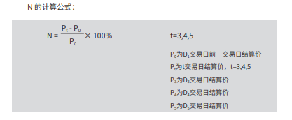 某期货合约连续三个交易日(即D1、D2、D3 交易日)的累计涨跌幅(N) 达到7.5% 、连续四个交易日(即D1、D2、D3、D4交易日)的累计涨跌幅(N) 达到9%或者连续五个交易日(即D1、D2、D3、D4、D5交易日)的累计涨跌 幅(N)达到10.5%的,能源中心可以根据市场情况,采取下列一种或者多种措 施,并事先报告中国证监会: