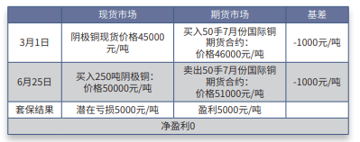 范例:2月份,某铜跨境贸易商了解到阴极铜现货价格为49000元/吨,对这 个价格比较满意,以此价格储备了一批铜现货以备未来销售;但是,该贸易商担 心现货市场上的过度供给会使得阴极铜价格下跌,从而产生严重亏损。为避免将 来价格下跌带来的风险,该跨境贸易商决定在上海国际能源交易中心进行国际铜 期货的卖出保值交易。其交易和损益情况如下表所示: