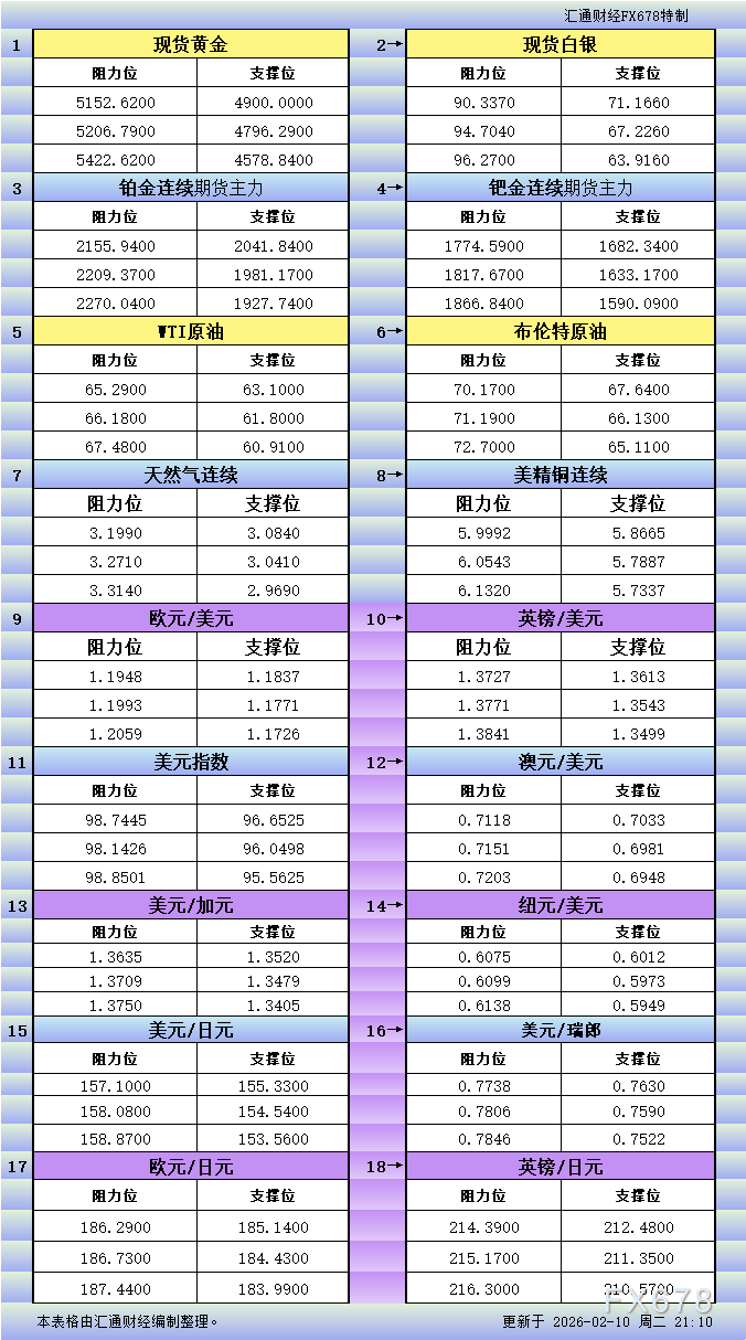 汇通财经APP讯——2月10日美市美市更新的黄金、白银、铂金、钯金、原油、天然气、铜(商品)以及:美元指数、欧元、英镑、日元、瑞郎、澳元、加元、纽元(热门货币对)的支撑阻力位一览。