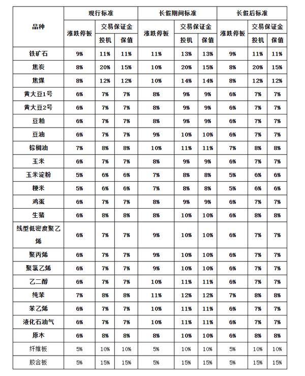 铁矿石、焦炭、焦煤、黄大豆1号、黄大豆2号、豆粕、豆油、棕榈油、玉米、玉米淀粉、粳米、鸡蛋、生猪、线型低密度聚乙烯、聚丙烯、聚氯乙烯、乙二醇、纯苯、苯乙烯、液化石油气和原木品种期货合约涨跌停板幅度和交易保证金水平恢复至节前标准;其他品种期货合约涨跌停板幅度和交易保证金水平维持不变。