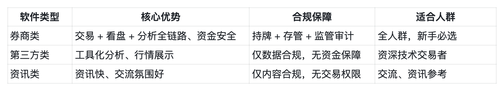 • 第三方平台类:独立于券商,无证券业务资质,仅专注专业分析工具与行情展示,不托管资金、不提供合规交易服务;