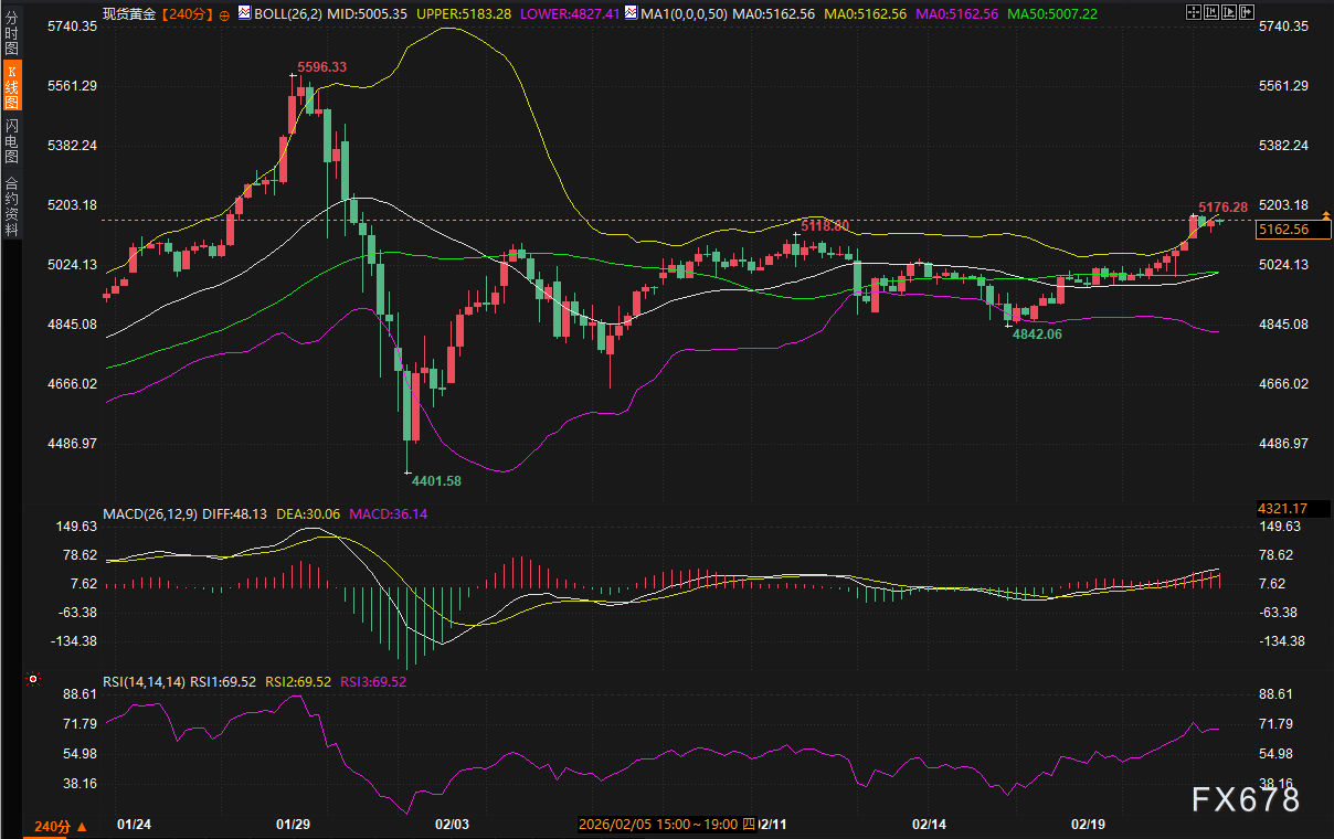 从240分钟级别的技术图表分析,黄金当前处于明确的短期上升趋势中。2月14日触及4842美元低点后,金价连续收阳,沿布林带中轨稳步抬升,目前已突破前期震荡平台高点5118美元。布林带指标显示,上轨位于5183美元,中轨支撑在5005美元,当前价格已接近上轨区域,短期存在技术性超买压力。RSI指标为69.52,接近70的超买阈值,MACD红柱虽持续放大,但已接近前期高点对应的峰值水平,表明上行动能可能逐步衰减。