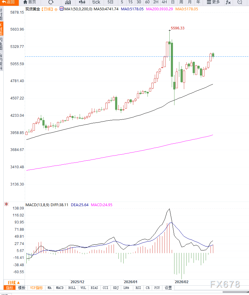从日线级别观察,黄金整体趋势结构仍然偏多,但短期已进入上涨后的结构性调整周期。价格在5230美元附近形成阶段性高点后开始回落,显示短期多头动能逐渐衰减。