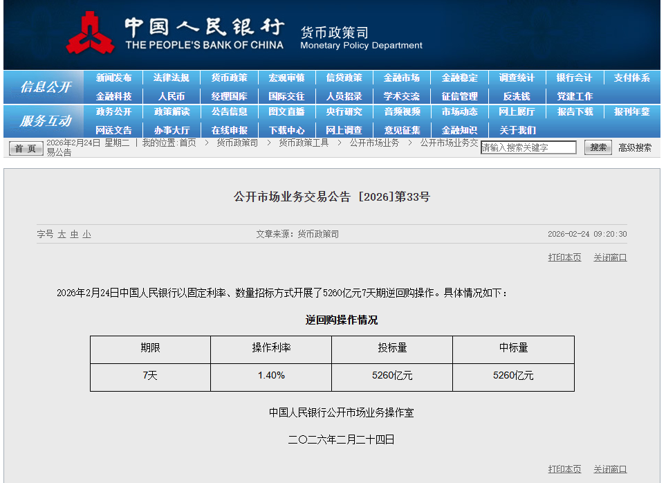 据央行官网消息,2026年2月24日中国人民银行以固定利率、数量招标方式开展了5260亿元7天期逆回购操作,操作利率1.4%。数据显示,当日有8524亿元7天期和6000亿元14天期逆回购到期,因此实现净回笼9264亿元。