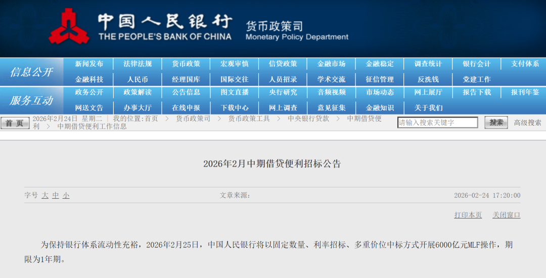 据央行官网,为保持银行体系流动性充裕,2026年2月25日,中国人民银行将以固定数量、利率招标、多重价位中标方式开展6000亿元MLF操作,期限为1年期。
