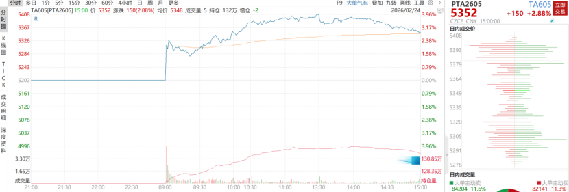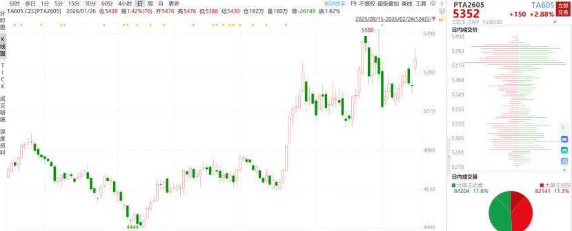 今日,PTA主力合约TA2605收涨2.88%至5,352元/吨。