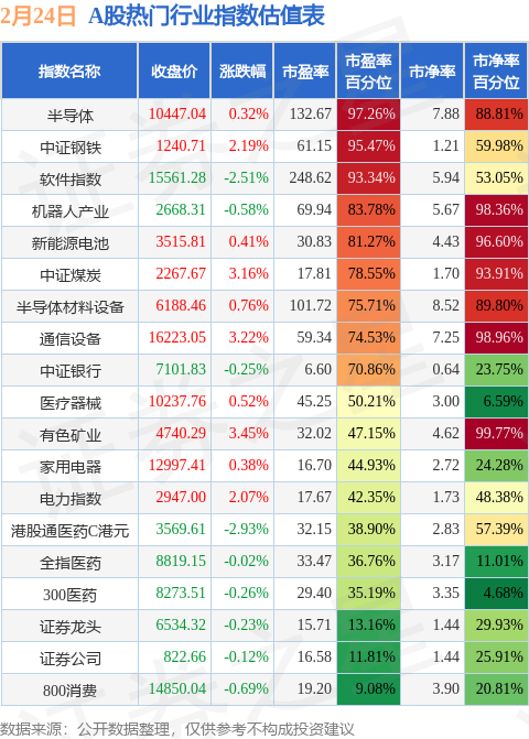 2月24日A股指数最新估值汇总