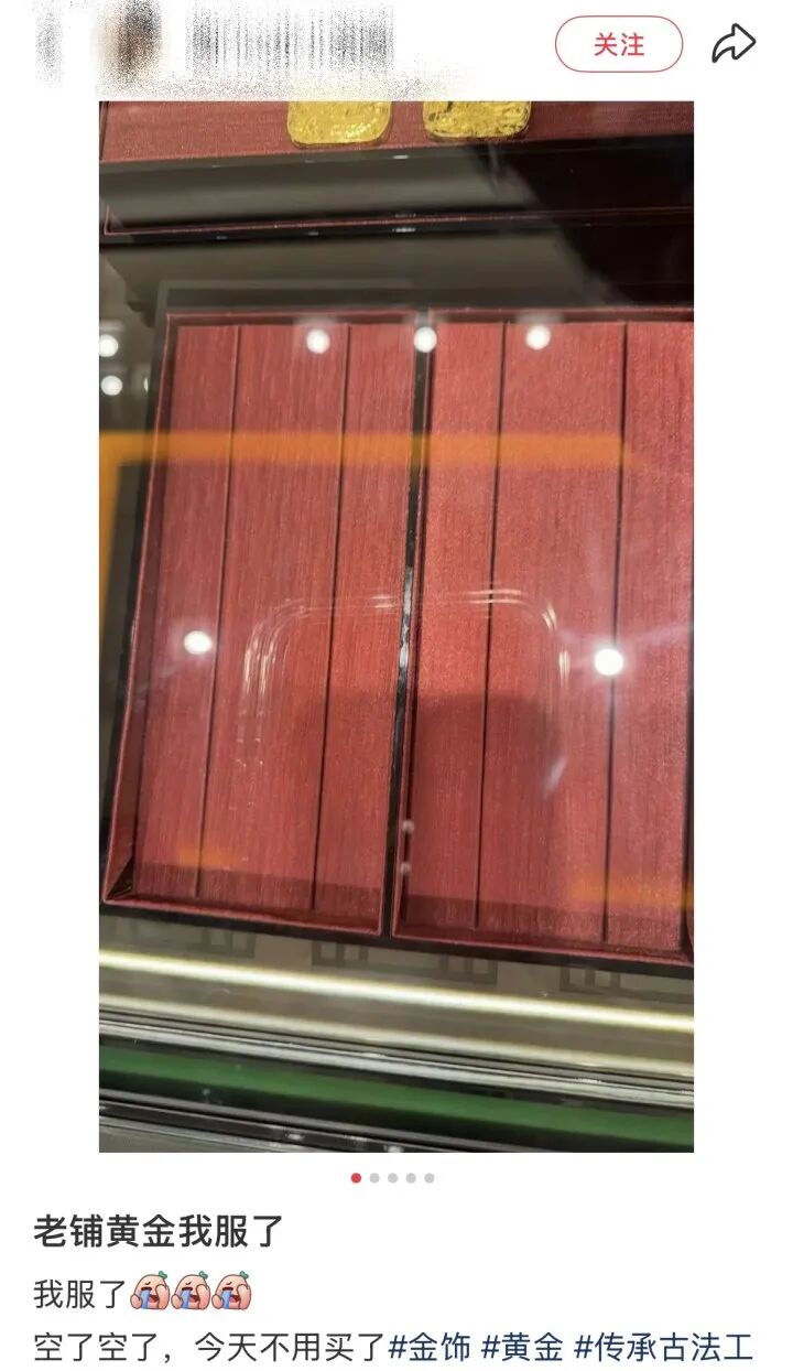 春节满减活动加上涨价预期,从春节前开始,老铺黄金很多门店出现通宵排长队抢购的情况,有些专柜甚至被抢购一空,成为商场里的一道另类风景。有网友开玩笑:“传说中的只剩柜台和柜姐了……”