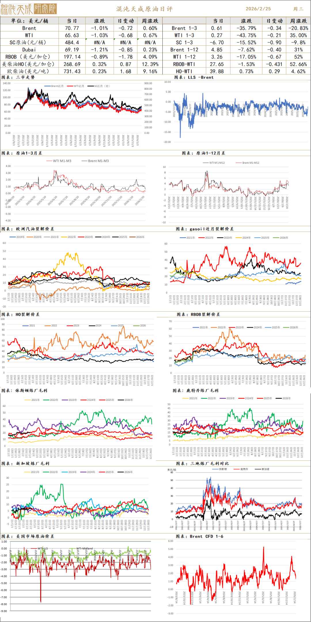 库存价差:截至2月20日,API原油库存上升1143万桶,汽油库存下降153万桶/日,馏分油库存下降277万桶/日。