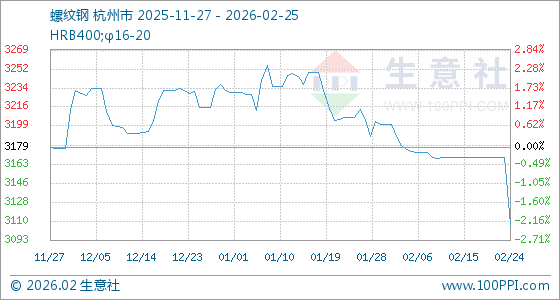 2月25日生意社螺纹钢基准价为3108.00元/吨