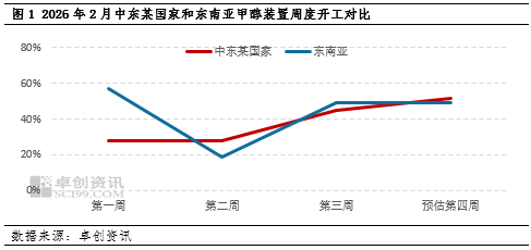 从图1可以看出,2026年2月亚洲多套甲醇装置停车检修中,中东某国和东南亚区域甲醇装置变动相对频繁。中东某国少数装置于2月初重启恢复,随后上周仍有一套165万吨甲醇装置重启恢复,目前中东某国家日度开工在45.18%,预估本周仍有少数甲醇装置重启恢复,预估本周中东某国家周度平均开工或将达到51.55%,相比2月初上升23.36个百分点。而东南亚2月份装置变动同样较大。2月第二周仍有装置加入非计划性检修行列,虽然印尼少数甲醇装置于春节期间重启恢复,但东南亚至今仍有2套总体260万吨甲醇装置停车检修中,预估本周(2月底)周度平均开工将在49.40%,相比2月初下降7.80个百分点。后期可关注中国和东南亚的价差变动。