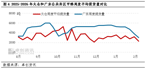 从图2和图3对比来看,2月份沿海甲醇库存呈现缓慢下降态势,而沿海MTO工厂原料甲醇库存呈现稳中上升态势,其它传统下游工厂2月同样维持原料库存适中位置。2月内实际交易日仅有16天,中间商背靠背操作和囤货过年积极性减弱,整体沿海公共库区提货量显著下降。从图4可以看出,节前最后一周(2月6日至2月12日),太仓总体库区甲醇平均一天提货量在1631.43-2310吨。想比1月底缩减890吨,广东平均一天提货量在3000吨,相比1月底宽幅缩减1700吨。受到多重因素影响,春节期间至今沿海多数公共仓储提货量延续下降,本周沿海甲醇库存依然难有显著下降趋势。