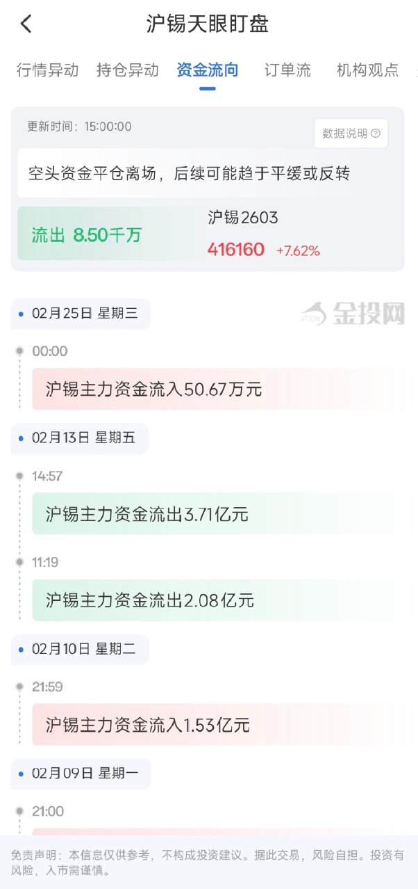 2026年2月25日收盘,金投网APP沪锡天眼盯盘资金流向数据显示:沪锡主力合约现涨7.62%,报416160.00元/吨,当日资金净流出8.50千万元,空头资金平仓离场,后续可能趋于平缓或反转。