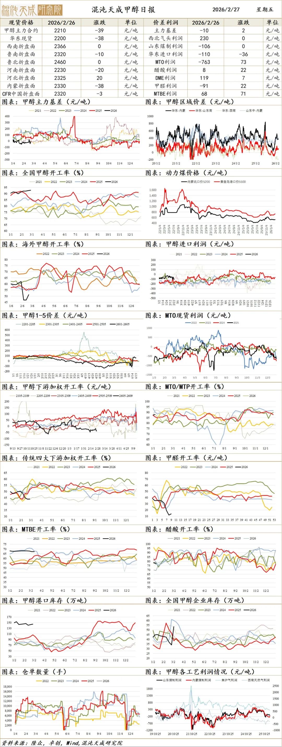 供应端:隆众数据,截止2.26日,开工率66%(+1.5)。煤头边际成本3600元/吨。MEG2026年仍有持续投产,过剩加剧格局明显。