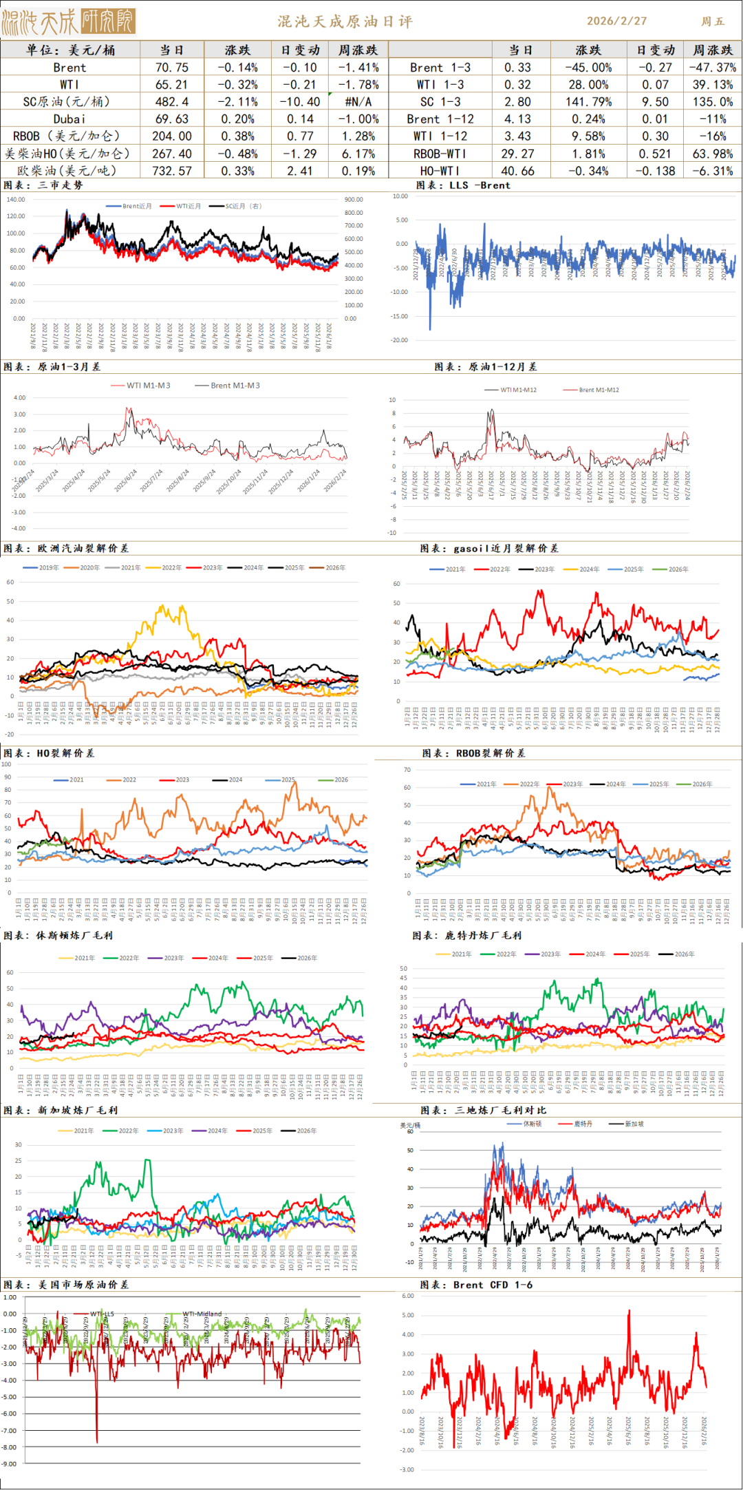库存价差:截至2月20日,EIA原油库存上升1599万桶,汽油库存下降101万桶/日,馏分油库存上升25万桶/日。