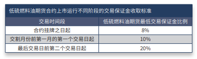 1、交易保证金制度 交易保证金是指会员存入能源中心专用结算账户中确保合约履行的资金, 是已被合约占用的保证金。低硫燃料油期货合约的最低交易保证金为合约价值的 8%。