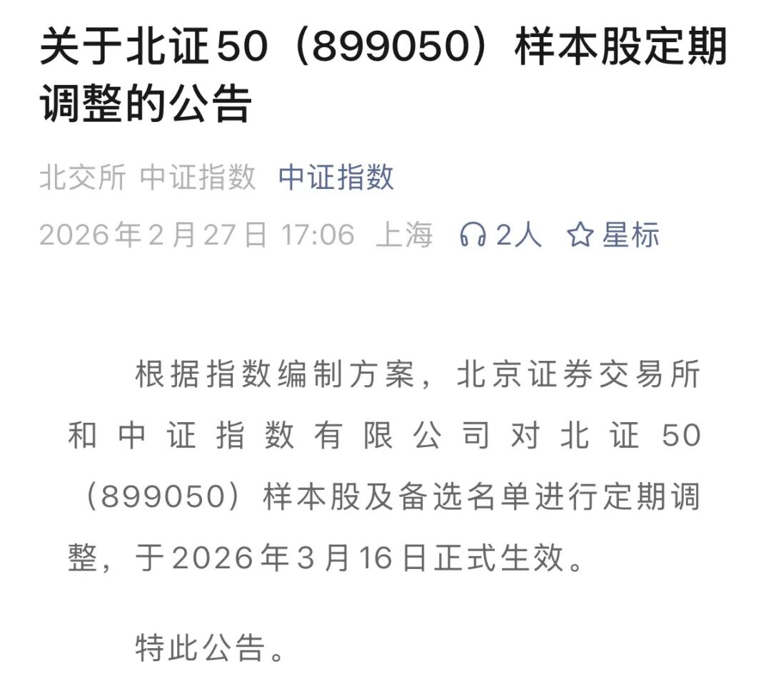 除科创板相关指数外,今日晚间,北交所和中证指数有限公司公告称,根据指数编制方案,双方对北证50指数样本股及备选名单进行定期调整,将于3月16日正式生效。