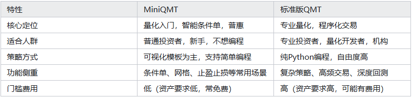 标准版QMT:面向专业投资者、机构、资深量化爱好者。你需要有一定的编程能力(主要用Python),自己从零开始搭建策略、风控、交易执行的全套流程。