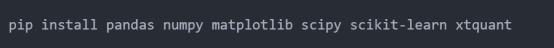 我这里用的行情数据源是 xtquant + miniQMT。 后续示例里会用到一些常见的 Python 库:pandas, numpy, matplotlib,进阶部分还会涉及 scipy, sklearn。在实际运行代码之前,记得先把环境配置好: