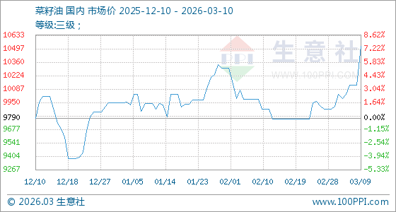 3月10日,生意社菜籽油基准价为10520.00元/吨,与本月初(9884.00元/吨)相比,上涨了6.43%。