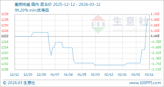 3月12日,生意社重质纯碱基准价为1235.71元/吨,与本月初(1202.86元/吨)相比,上涨了2.73%。