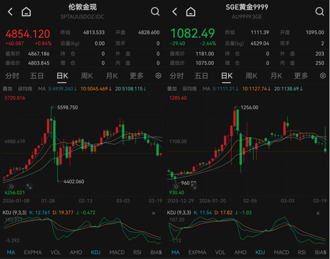 数据显示,截至发稿,伦敦现货黄金价报4854.12美元/盎司,日内上涨0.84%,前一交易日下跌3.86%;上海黄金交易所现货黄金(Au99.99)价报1082.49元/克,日内下跌2.64%。