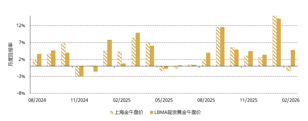 上海SHAUPM午盘金价和伦敦LBMA午盘金价的月度回报率