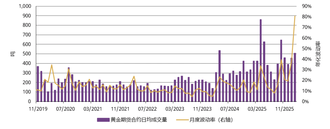 上海期货交易所(SHFE)的黄金期货日均交易量达505吨,环比增长11%。金价波动加剧提升了战术交易者对黄金期货的兴趣,这一现象在2月初尤为明显,当时金价波动率与黄金交易量双双大幅攀升。