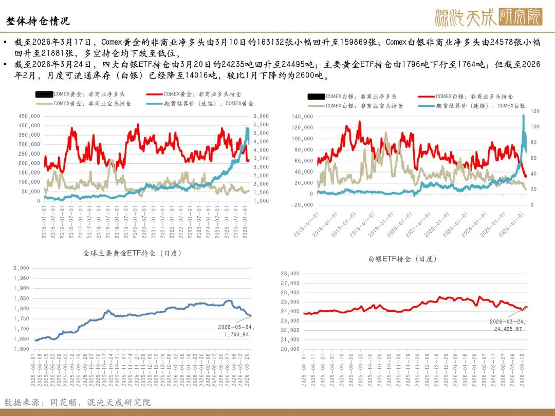 贵金属在地缘风险上行的环境中,前期追随地缘-油价-通胀预期-流动性的传导链条,而现阶段美元美债信用的长周期传导路径开始一定程度上驱动市场,所以贵金属同步美债利率出现上行。对于贵金属,特别是黄金的定价,更重要的依旧是“货币信用”的定价,这涉及到的是政治地缘等因素而非单经济数据,短线级别的流动性仍不是主导其趋势转弱的驱动;对于白银而言,其库存仍在显著走弱,投机头寸在低位,后续实物定价仍具备。战争带来的冲击不仅仅对于流动性,而是整体货币框架,在贵金属的定价中需要考虑长期影响。