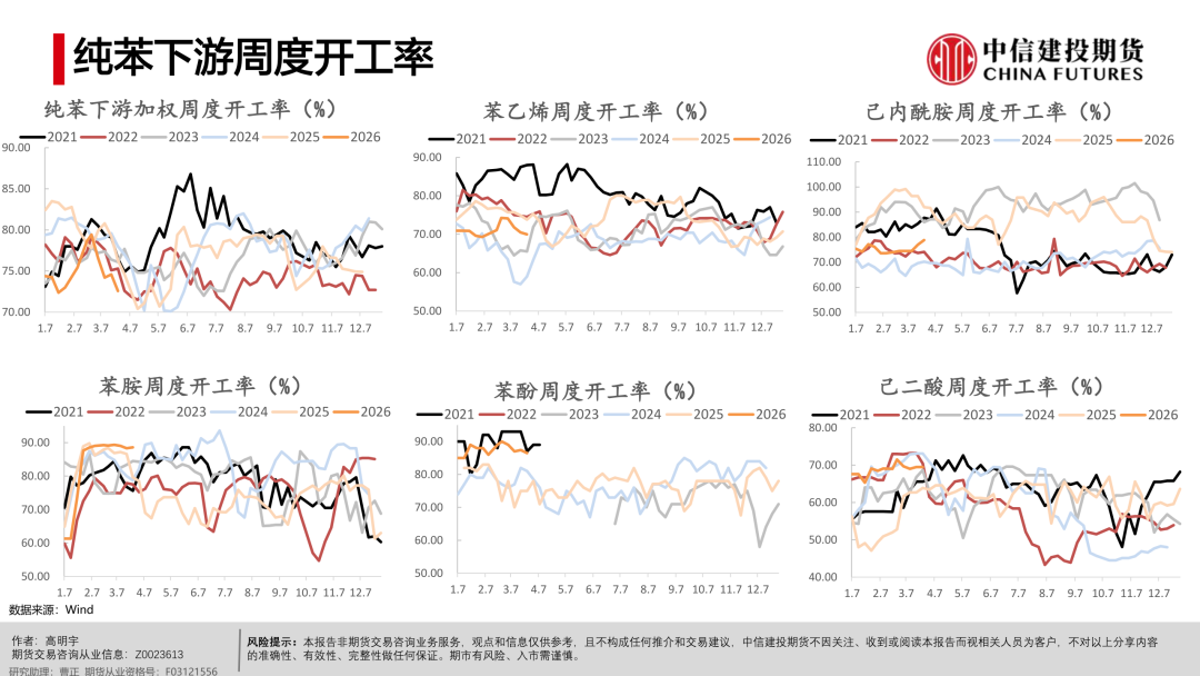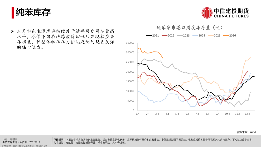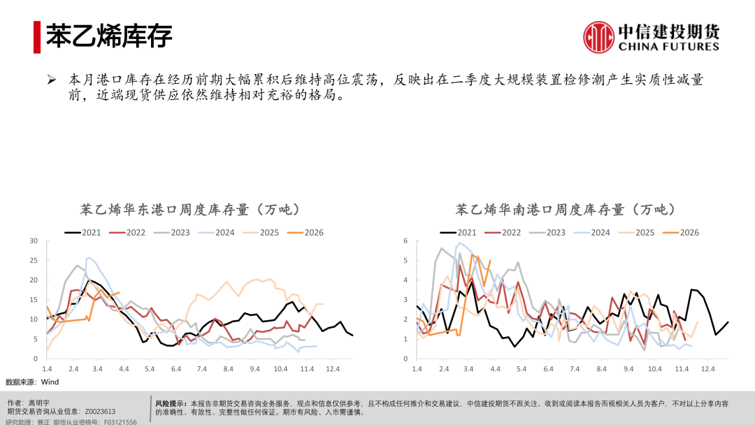 纯苯预计四月将维持震荡筑底态势。高库存是制约其估值上行的核心阻力,在库存完成实质性去化前,纯苯将继续受制于近端现货的抛售压力,基差维持偏弱运行。苯乙烯表现将明显优于纯苯。随着四月检修季正式开启,供应端的收缩将有效对冲成本下行的风险。若下游需求在利润修复后有所回升,苯乙烯有望迎来估值反弹。