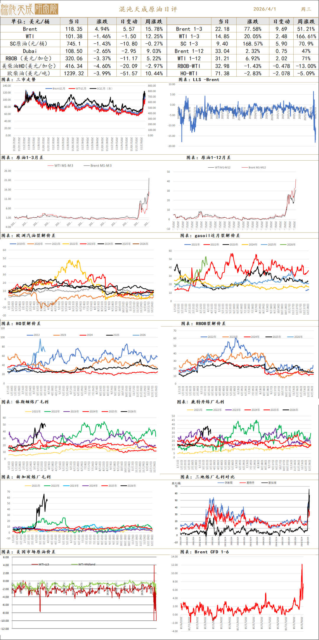 2、海峡持续封闭仍在持续,但第二轮降负预计4月开始逐步兑现,基本面真空期。因有浮仓补充及绕行缓解,亚洲炼厂缺原料格局不变,但二轮降负荷程度、具体影响多少供应量待验证。