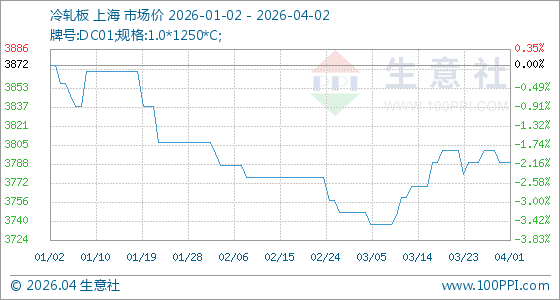 4月2日,生意社冷轧板基准价为3790.00元/吨,与本月初持平。