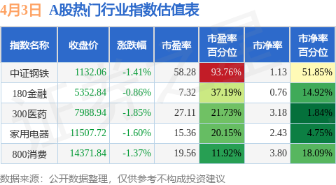 热门行业指数方面,中证钢铁的市盈率百分位较高,为93.76%。而800消费的市盈率百分位较低,为11.92%。