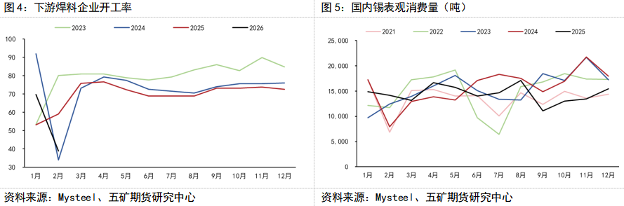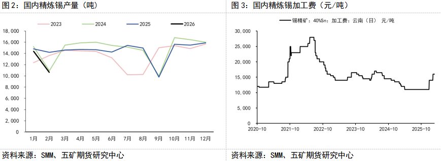 锡矿紧缺修复向冶炼端传导。从云南地区加工费来看,目前锡矿紧缺现象已经出现明确缓解。从月度产量看,目前云南地区锡锭产量相比2025上半年已经有了提升,单月产量增加600吨,江西地区产量则位于偏低水平。总体来看,2026年国内精炼锡产量预计较2025年增加1.1万吨。