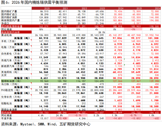 2025年,尽管半导体销售额高速增长,但从量的角度并未观察到锡锭消费的明显增量。反而受制于高锡价,传统领域消费下滑明显,全年国内精炼锡消费量同比下滑0.7%。2026年,随着传统领域需求的企稳以及AI领域需求的放量,预计锡消费同比增长1.0%。
