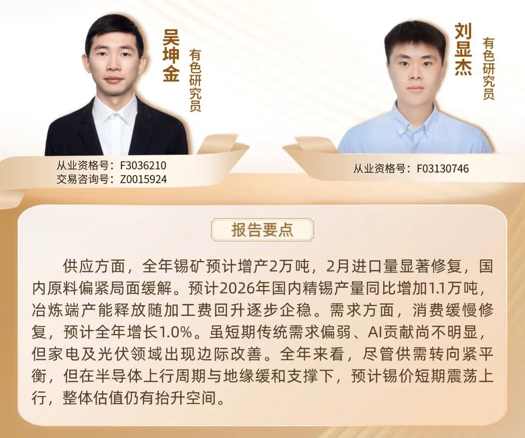 年度来看,我们对锡价仍维持偏强判断。一方面,尽管全球供需由紧缺转为紧平衡,但下游阶段性的补库需求为价格提供支撑;另一方面,尽管AI领域对锡需求增量尚不明显,但在半导体上行周期中,锡价估值仍有进一步抬升空间。