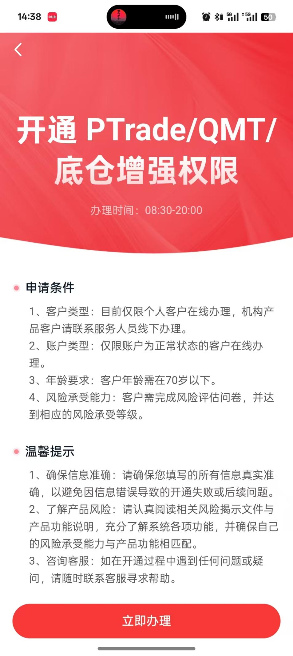 3. 避 “权限错配” 坑QMT 特殊功能模块复杂性较高,仅对专业投资者开放一对一咨询,普通投资者请勿主动申请超出自身风险承受能力的功能。