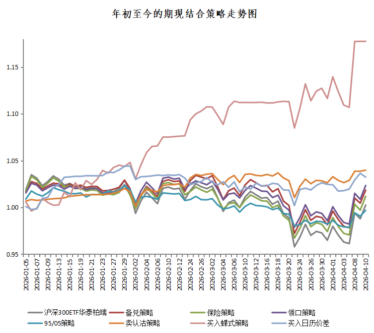 我们对期现结合的七个策略(备兑、保险、领口、95/05配置、卖认沽、买入蝶式策略、买入日历价差策略)及沪深300ETF华泰柏瑞现货,在上周(2026.4.7-2026.4.10)的表现进行了回测。上周沪深300ETF华泰柏瑞大涨,买入蝶式策略表现较好,且在4月8日止盈,保险策略和领口策略则在3月23日已止盈。具体结果如下: