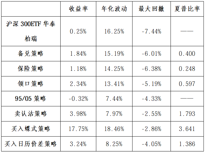 注:保险策略、领口策略、买入蝶式策略、买入日历价差策略有止盈机制,详见文末的策略注释。