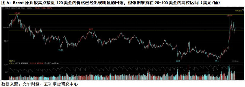 中东局势缓和的背景下,Brent原油较高点接近120美金的价格已经出现明显的回落,但当前依旧维持在90-100美金的高位区间波动。