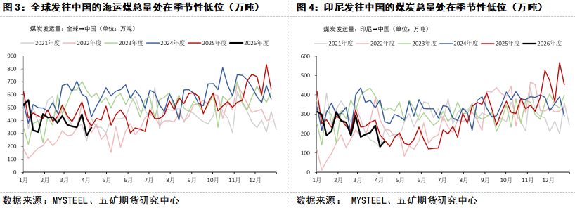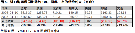 首先,是进口海运煤方面所面临的供给约束。从全球煤炭发运统计数据(钢联口径)可以看出,全球发往中国的煤炭总量持续处在季节性低位区间,截止4月上旬,累计同比降约650万吨或-10.5%。其中,印尼发往中国的煤炭总量累计同比-290万吨或-8.3%。海运煤确实面临一定供给约束,但从绝对数值上看,尚不强烈,后续需继续跟踪是否出现进一步强化。