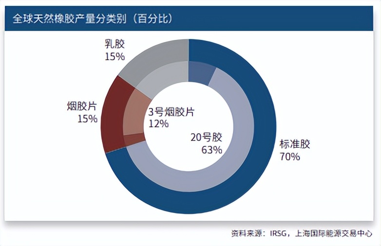 全球天然橡胶产品中,标准胶、烟胶片、乳胶占比分别约为70%、15%、 15%。在标准胶中,20号胶占比约90%。2018年,全球生产天然橡胶1387万 吨,其中20号胶约873万吨,占全球天然橡胶产量的63%。目前,20号胶已是全 球天然橡胶生产、消费的主要品种。